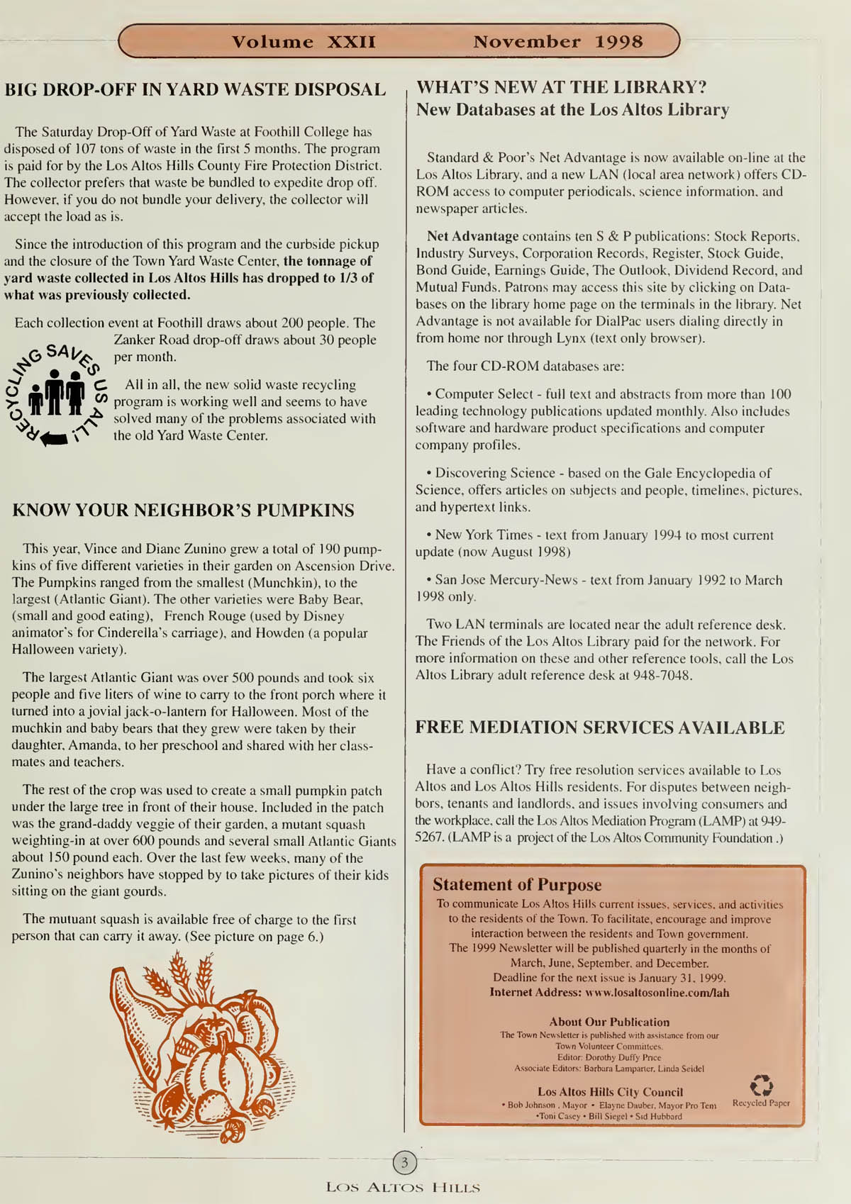 Drop off in yard waste disposal, Know your neighbors pumpkins (Zunino), What's new at the library, Free mediation services available |