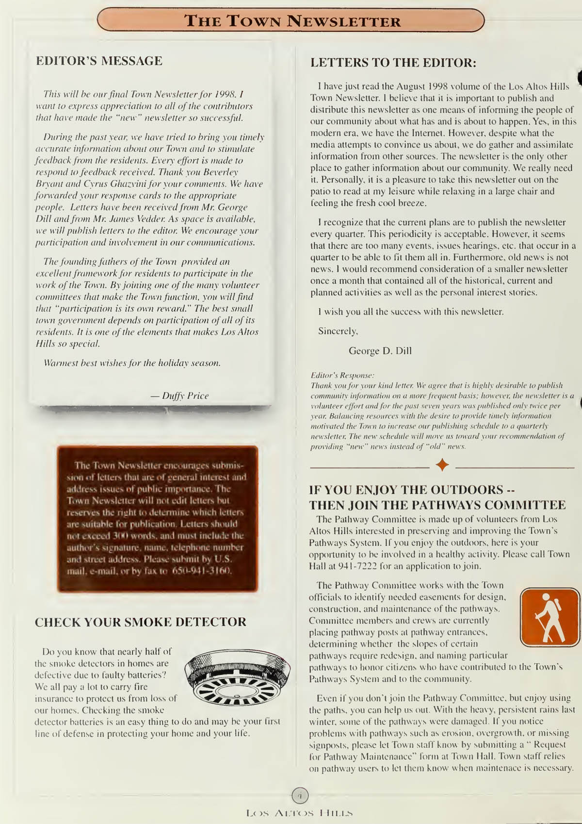 Editor's Message, Check your smoke detector, Letter To The Editor from George Dill, If you enjoy the outdoors - join the Pathways Committe |