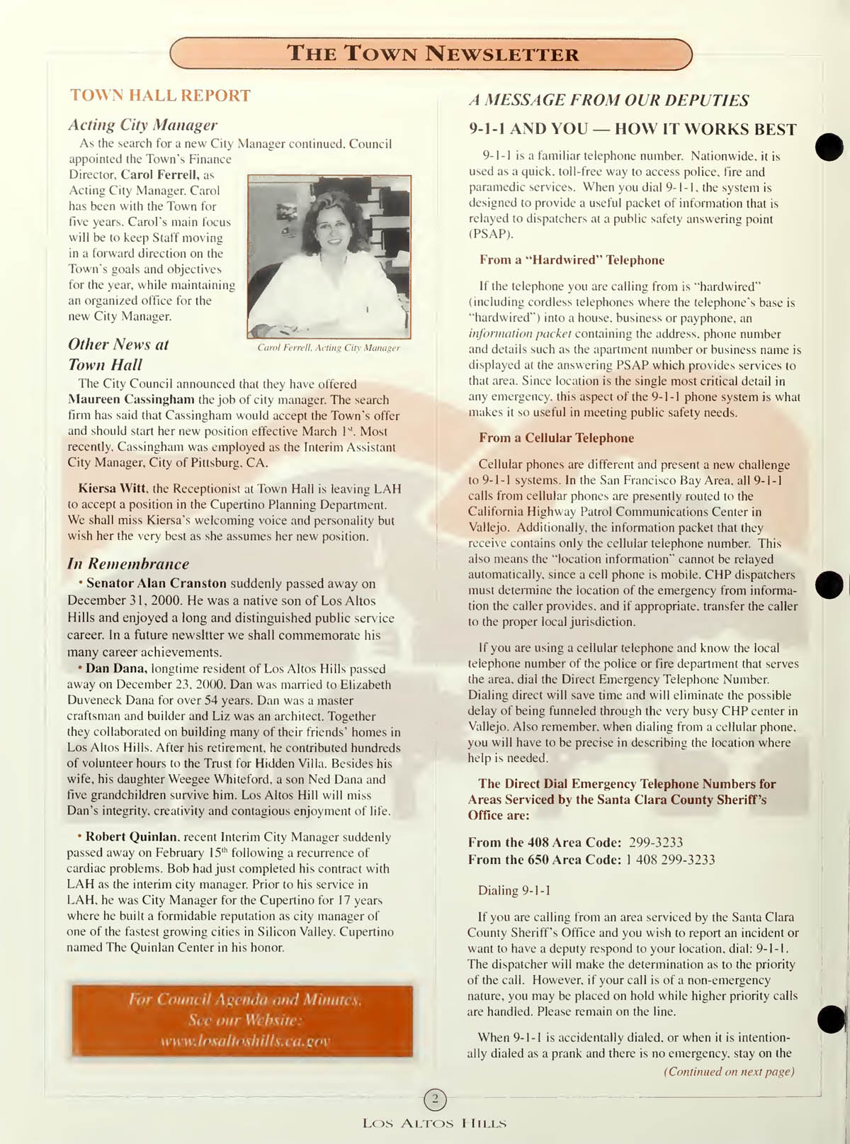 leaving - In Remembrance Senator Alan Cranston - Dan Dana - Robert Quinlan, Message from Sheriff - 911 how it works best. |