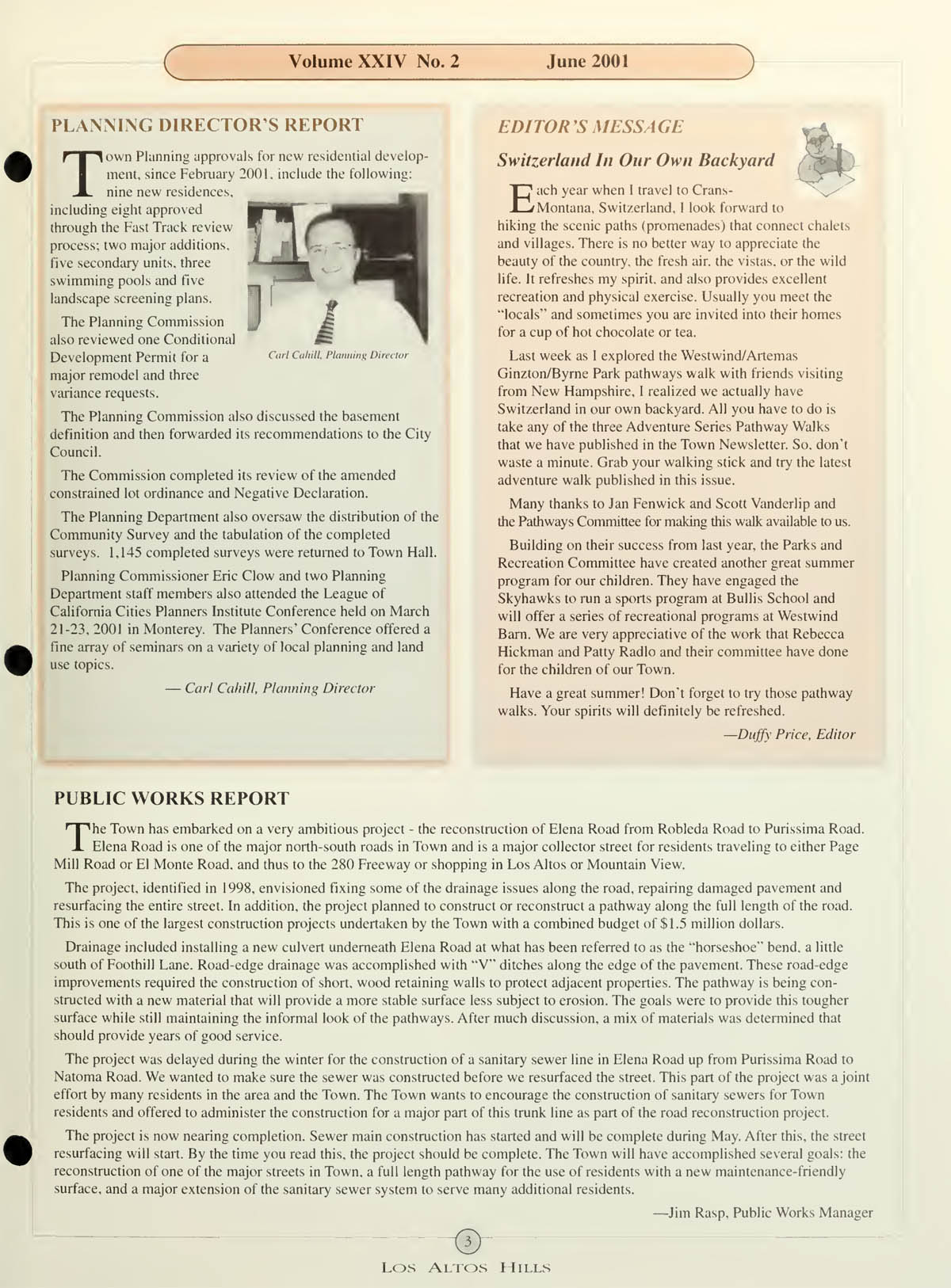 Planning Director's Report, Public Works Report - Reconstruction of Elena, Editor's Message - Switzerland in our backyard |