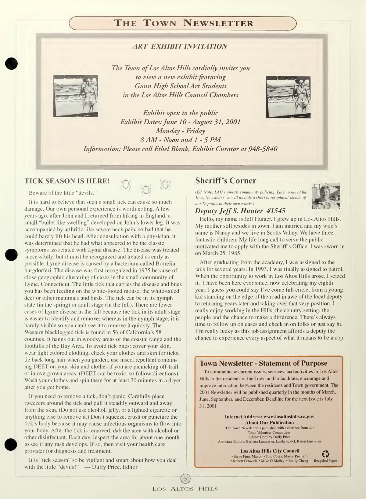 Art Exibit invitation - art by Gunn High School students, Beware - Tick season is here, Sheriff's Corner - Deputy Jeff Hunter |