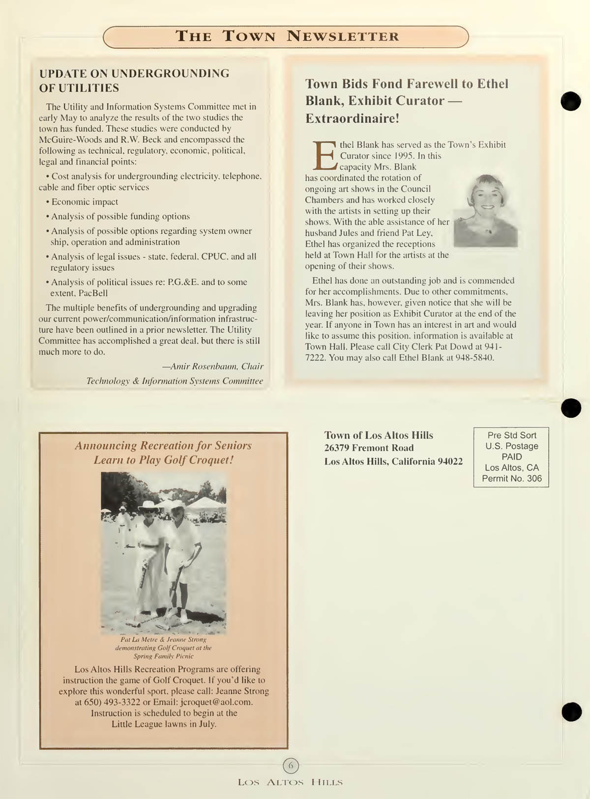 Update on undergrounding of utilites, Recreation for seniors - Golf Croquet, Farewell to Ethel Blank - Art Exhibit Curator |