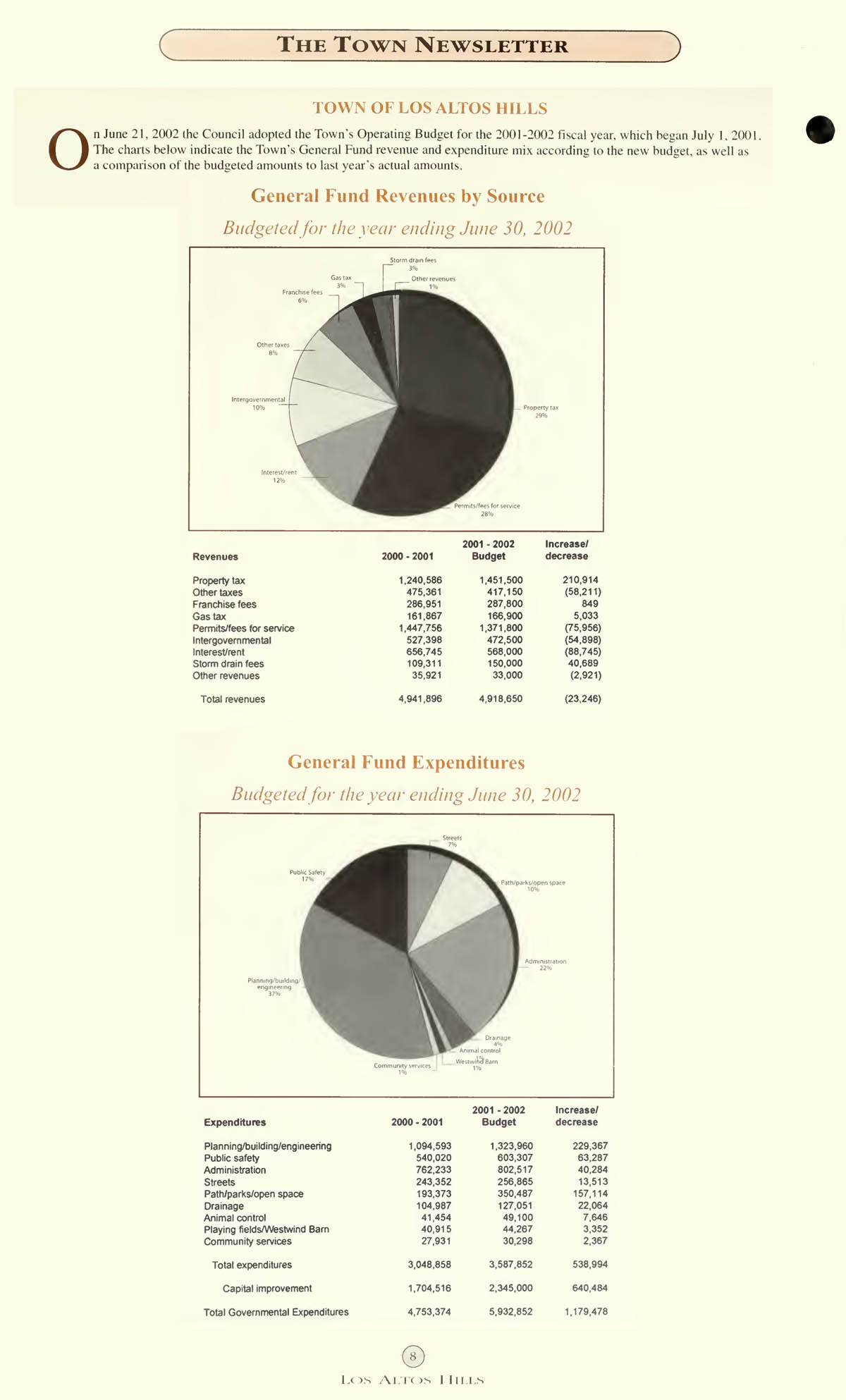 Town's Budget Adopted - Figures and Pie Charts of Revenues and Expenditures |