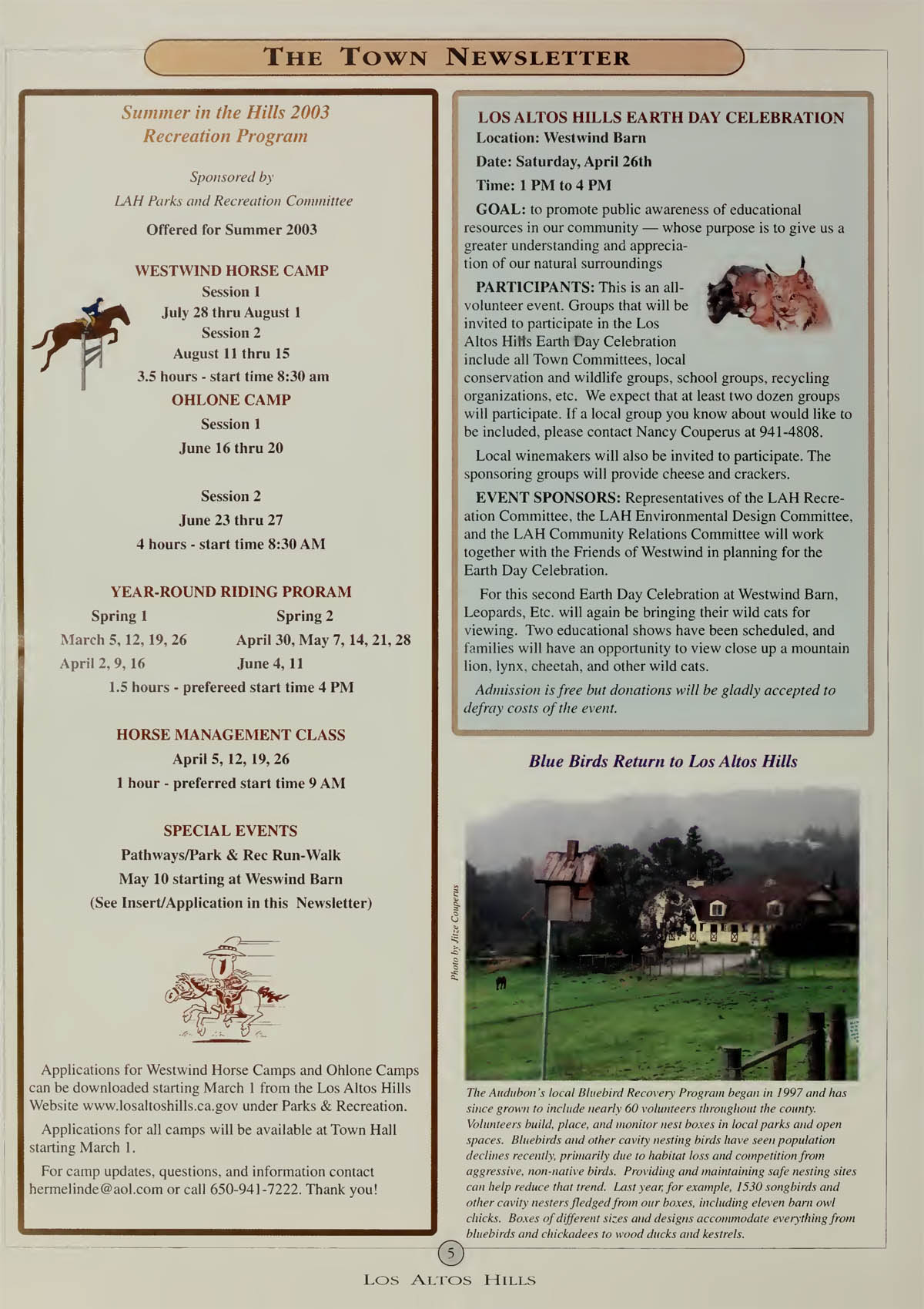 Summer in The Hills Recreation Programs, Earth Day Celebration planned at Westwind, Bluebirds return to Los Altos Hills |
