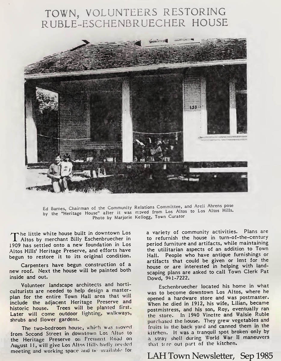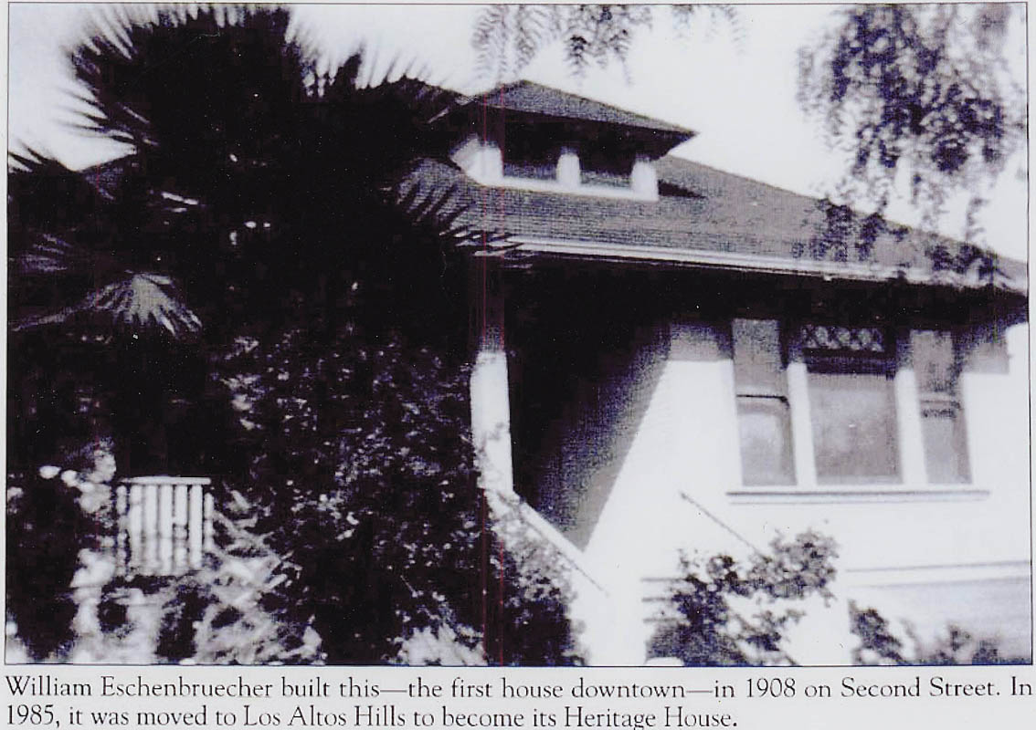 ![]() This flurry of activity inspired an even bigger gift when a group of local residents - headed by Abigail (Areli) Ahrens and Ed Barnes (Chairman of the Town's Community Relations Committee) and a few others managed to arrange for the donation of "The Eschenbruecher House (Built 1908 on 2nd Street in Los Altos) and to have it moved and repositioned in the area recently designated as the Heritage Park. After moving and repositioning it on a new foundation and repairing the roof, it became established there as "The Heritage House" |