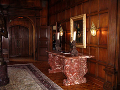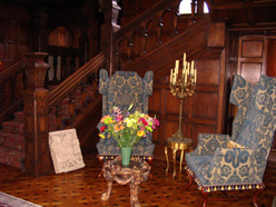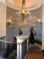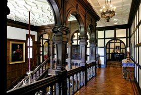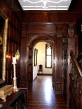 The plaster ceiling in the grand stair hall has mahogany detailing.